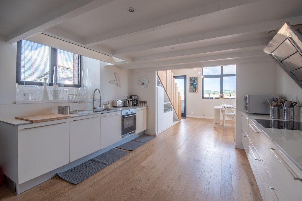 Initialement hangar pour construire des bateaux en bois, ce superbe bâtiment entièrement rénové continue de respirer et de vivre au rythme de la mer.